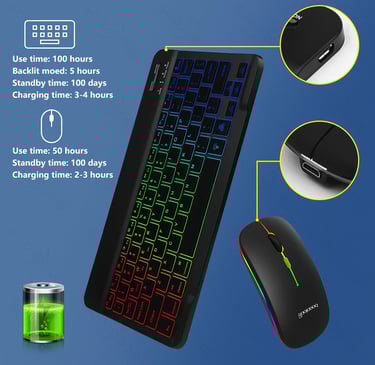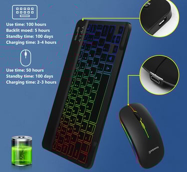 Clavier et souris sans fil rétroéclairés pour iPad, IOS, Android, Windows, Bluetooth, 10 pouces